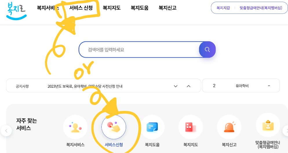 복지로 사이트에 들어가자 마자 바로 안내가 나오네요!